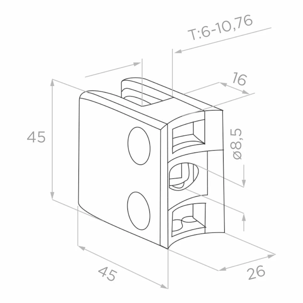 Ορθογώνια βάση για γυαλί σχεδιασμένη για στερέωση γυάλινων πάνελ πάχους από 6 έως 10,76 mm σε κολώνες σωλήνων διαμέτρου 42,4 mm. Κατασκευασμένη από ανοξείδωτο ατσάλι AISI 304 με φινίρισμα σατινέ — αισθητικό και ανθεκτικό στοιχείο για κάγκελα και γυάλινα διαχωριστικά.