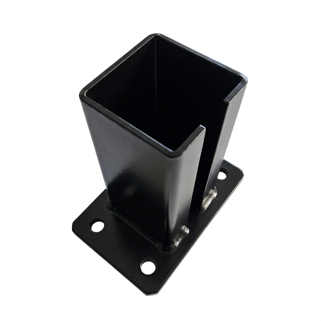 Η ατσάλινη βάση (πόδι) για στύλο πύλης και περίφραξης 80×80 mm σε μαύρο χρώμα RAL 9005 είναι ένα ανθεκτικό στοιχείο στήριξης που επιτρέπει την γρήγορη και ασφαλή στερέωση προφίλ στύλων σε τσιμεντένιες επιφάνειες, τοιχοποιίες και άλλες σκληρυμένες επιφάνειες. Χάρη στο φινίρισμα με ηλεκτροστατική βαφή σκόνης σε χρώμα RAL 9005 το προϊόν εξασφαλίζει αισθητική, ομοιόμορφη εμφάνιση που συνδυάζεται ιδανικά με σύγχρονες πάνελ περιφράξεις και πύλες σε μαύρες αποχρώσεις — παράλληλα με αποτελεσματική αντιδιαβρωτική προστασία.