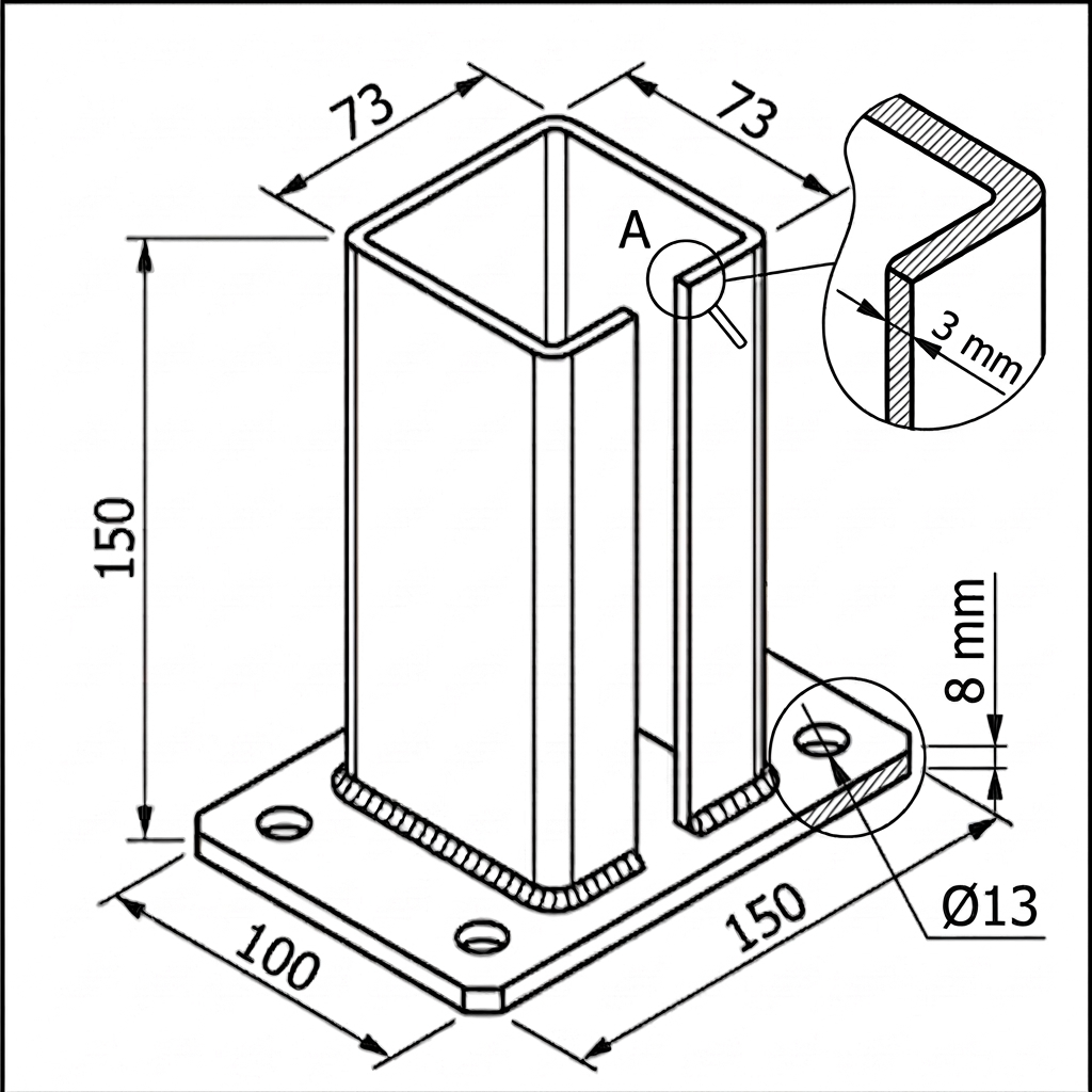 Η κατασκευή αποτελείται από ανοιχτό τετράγωνο προφίλ 73×73 mm (προσαρμοσμένο για στύλο 80×80 mm) συγκολλημένο σε μια μαζική πλάκα στήριξης με πέντε οπές για βίδες αγκύρωσης. Η γωνιακή συγκόλληση στη βάση του προφίλ εγγυάται την στερεή μεταφορά φορτίων. Η κάθετη σχισμή στο προφίλ επιτρέπει την ακριβή προσαρμογή και αντιστάθμιση των ανοχών του στύλου.