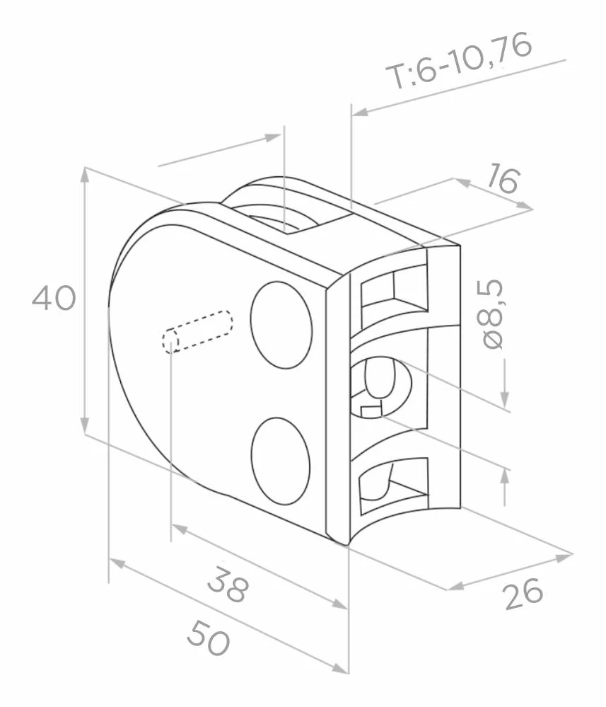 Σύνδεσμος γυαλιού 50×40×26 mm από zamak είναι ένα σταθερό στοιχείο στερέωσης σχεδιασμένο για την τοποθέτηση γυάλινων πάνελ πάχους από 6 έως 10,76 mm. Χάρη στην κατασκευή του που προσαρμόζεται σε σωλήνα διαμέτρου 42,4 mm, ο σύνδεσμος αποτελεί ιδανική λύση για κιγκλιδώματα, περιφράξεις και γυάλινες κατασκευές — τόσο σε εσωτερικούς όσο και σε εξωτερικούς χώρους.