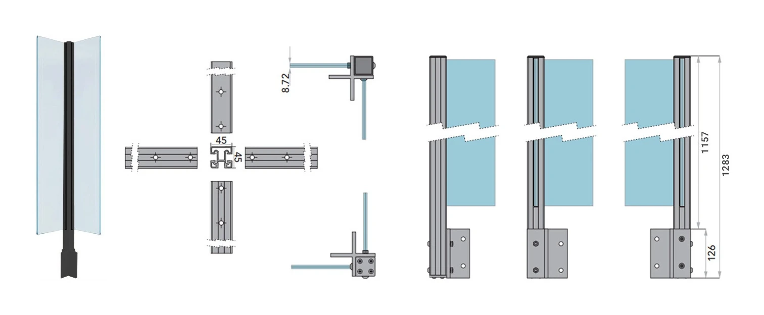 - Τύπος στύλου: εξωτερικός γωνιακός — σταθερή καθοδήγηση γυαλιού υπό γωνία στις γωνίες