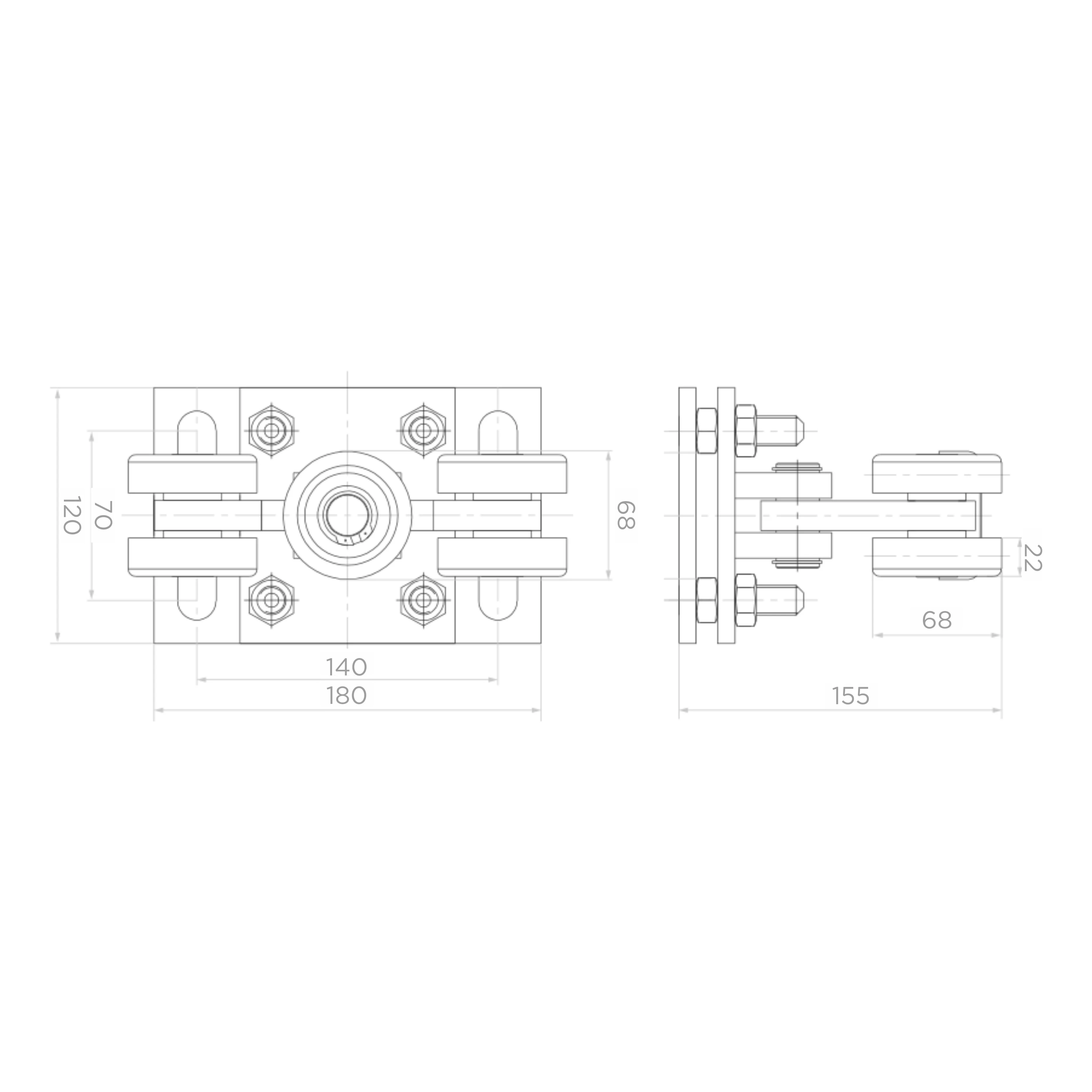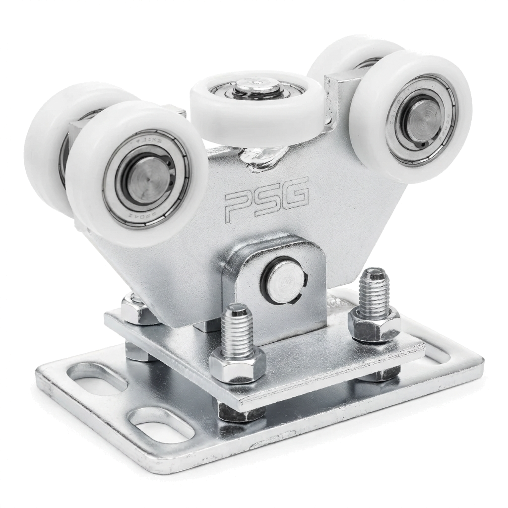 Το φορείο διαθέτει 5 τροχούς από πλαστικό – 4 κατακόρυφους και 1 οριζόντιο για τη σταθεροποίηση πλευρικών αποκλίσεων της πύλης. Οι τροχοί είναι τοποθετημένοι σε ρουλεμάν σφαιρών, γεγονός που εγγυάται μακρά διάρκεια ζωής και ελάχιστη αντίσταση κύλισης. Η σύνδεση με τη βάση στερέωσης πραγματοποιείται μέσω ατράκτου που επιτρέπει την αιώρηση του φορείου και την αντιστάθμιση τυχόν ανωμαλιών της τροχιάς.
