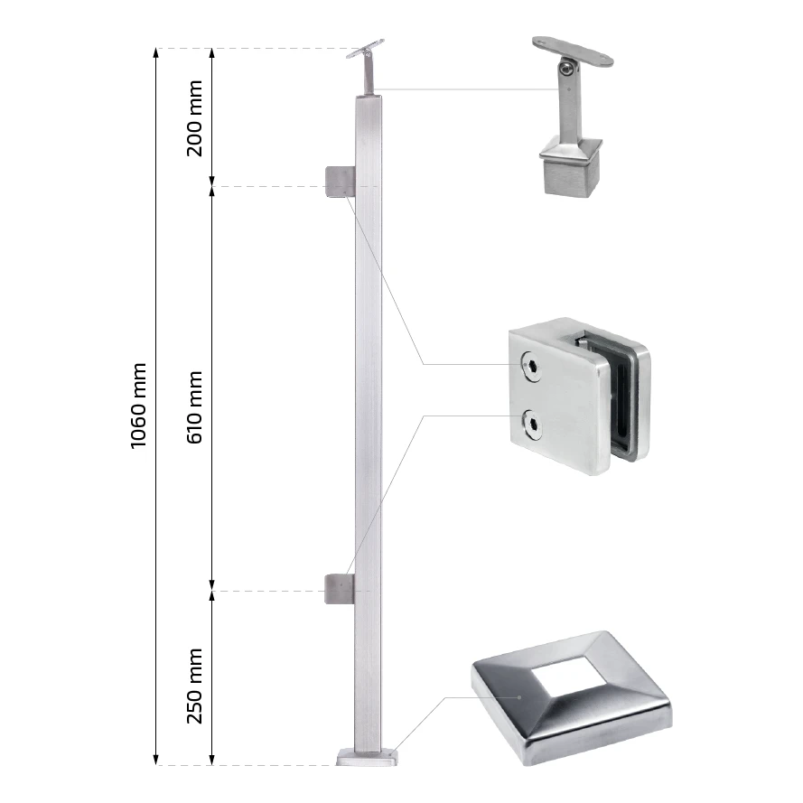 Η κολώνα είναι καθολική λύση για κιγκλιδώματα συνολικού ύψους μαζί με την κουπαστή 1100 mm. Το στήριγμα της κουπαστής δεν είναι μόνιμα κολλημένο — για τη στερέωσή του πρέπει να χρησιμοποιηθεί αναερόβια κόλλα για ανοξείδωτο ατσάλι. Αυτή η λύση δίνει πλήρη ελευθερία κατά την τοποθέτηση: η τοποθέτηση της κολώνας μπορεί να προσαρμοστεί στις συνθήκες του εργοταξίου, και σε περίπτωση ανωμαλιών του δαπέδου η κολώνα μπορεί να κοπεί στο απαιτούμενο μήκος. Το σετ περιλαμβάνει λαστιχάκια για γυαλί 8 mm — σε περίπτωση χρήσης γυαλιού διαφορετικού πάχους αρκεί να επιλεγεί το κατάλληλο μέγεθος στεγανοποίησης.