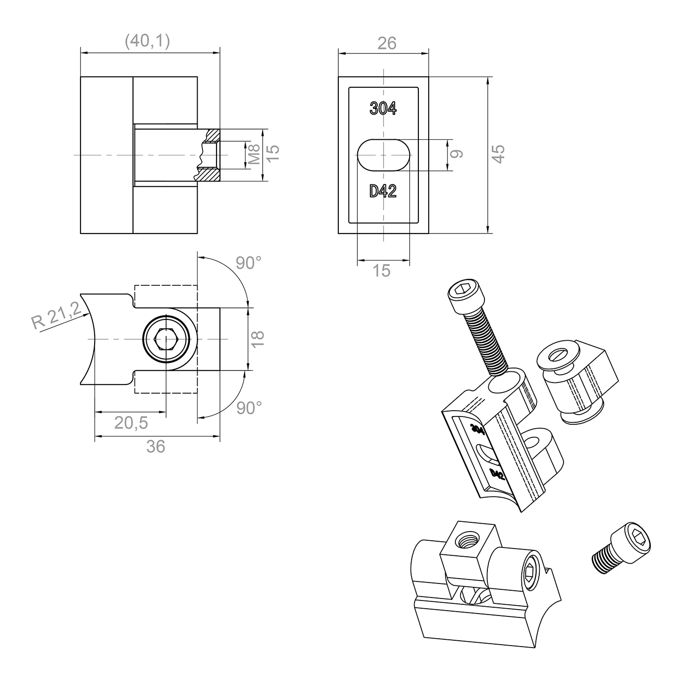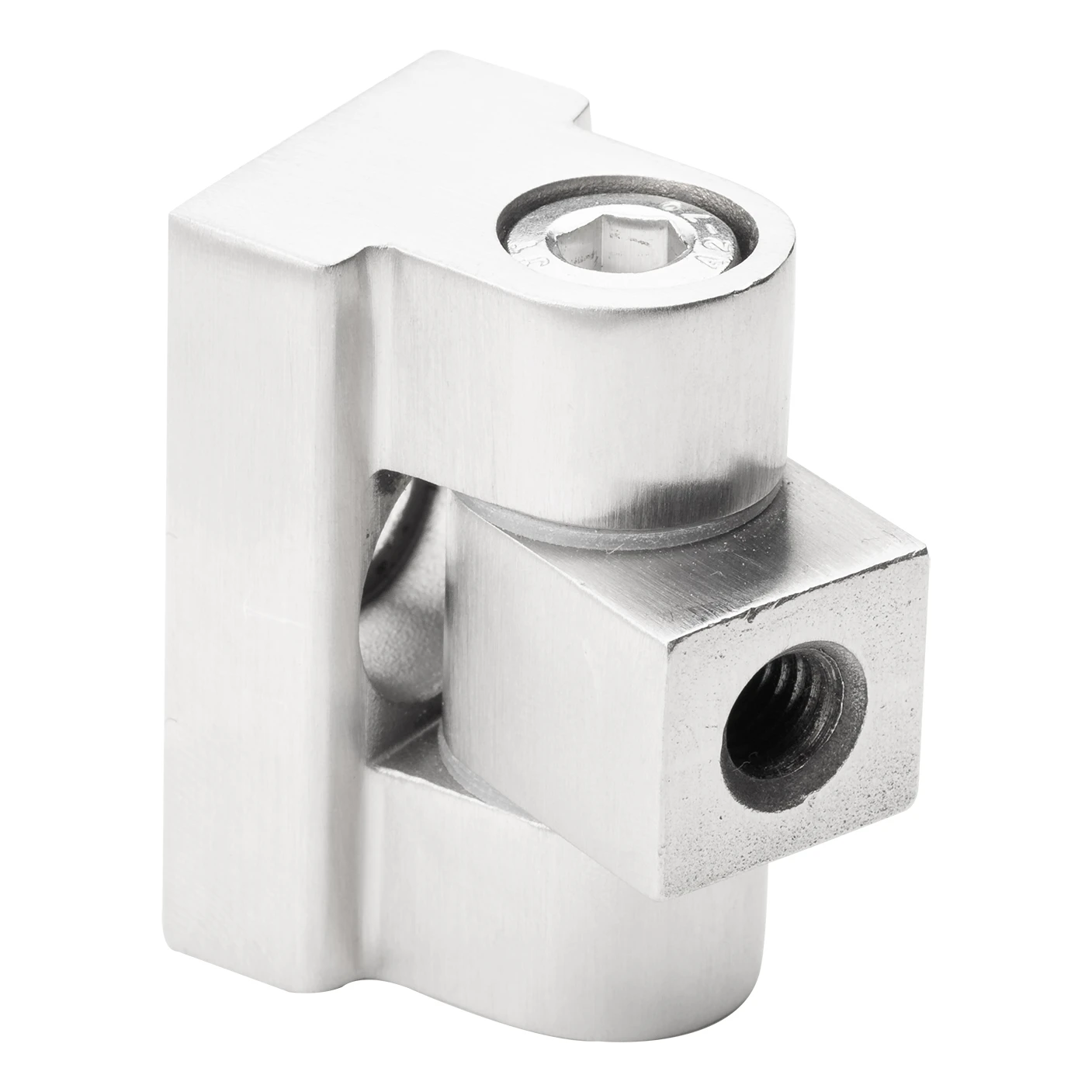 Μεντεσές 180° για στήριγμα γυαλιού από ανοξείδωτο χάλυβα AISI 304 με σατινέ φινίρισμα — ακριβές στοιχείο σύνδεσης προορισμένο για συστήματα γυάλινων κιγκλιδώσεων που εγκαθίστανται σε σωλήνες διαμέτρου 42,4 mm. Χάρη στο πλήρες εύρος περιστροφής 180° (2 × 90°) επιτρέπει την ομαλή ρύθμιση της γωνίας τοποθέτησης των γυάλινων πάνελ, διευκολύνοντας σημαντικά τη συναρμολόγηση σε ασυνήθιστα σχήματα κατασκευών.