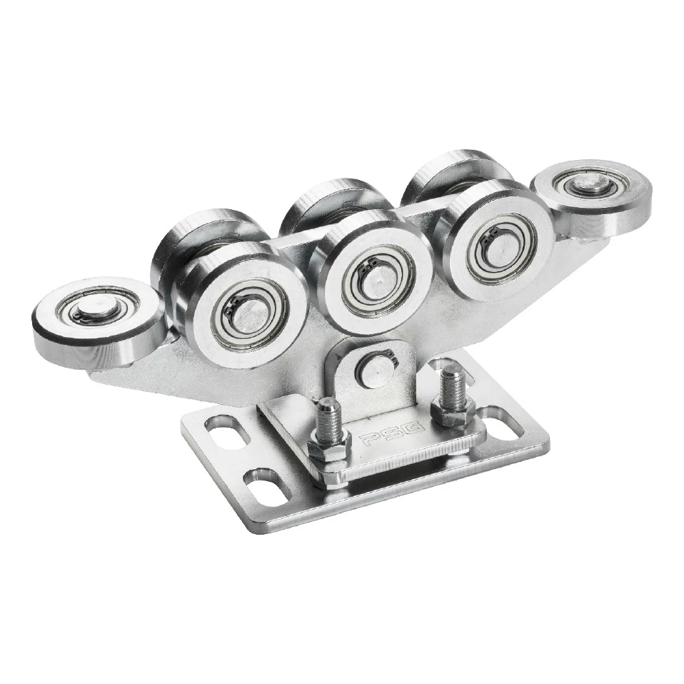 Το τροχοφόρο είναι εξοπλισμένο με 8 ατσάλινα ρολά, εκ των οποίων δύο οριζόντια, εξασφαλίζοντας ομοιόμορφη κατανομή φορτίου και ομαλή κίνηση της πύλης. Η αρθρωτή κατασκευή – το τροχοφόρο συνδέεται με τη βάση μέσω άξονα – επιτρέπει αυτόματη προσαρμογή στη ράγα της πύλης. Η ρύθμιση ύψους γίνεται μέσω βιδών, διευκολύνοντας την ακριβή τοποθέτηση κατά τη συναρμολόγηση. Το μέγιστο φορτίο ανά τροχοφόρο είναι 1000 kg.