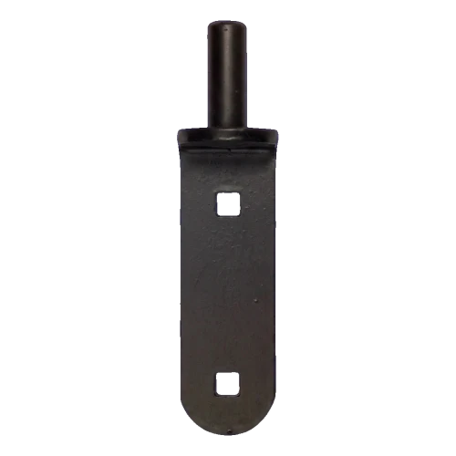 Ο πείρος είναι κατασκευασμένος από μαύρο χάλυβα, που εξασφαλίζει υψηλή μηχανική αντοχή και αισθητικό παρουσιαστικό που ταιριάζει με φράκτες και πύλες σε σκούρες αποχρώσεις. Το γωνιακό προφίλ επιτρέπει την επίπεδη τοποθέτηση στον στύλο — ο άξονας προεξέχει κάθετα, δημιουργώντας άξονα περιστροφής για το μεντεσέ ιμάντα. Οι δύο τετράγωνες οπές στήριξης επιτρέπουν γρήγορο και ασφαλές βίδωμα του στοιχείου, γεγονός που επιταχύνει σημαντικά τις εργασίες εγκατάστασης στο εργοτάξιο.