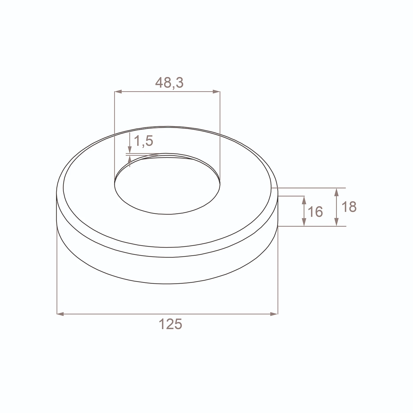 Ροζέτα κάλυψης στρογγυλή διαμέτρου 125 mm σχεδιασμένη για σωλήνα διαμέτρου 48,3 mm — αισθητικό στοιχείο φινιρίσματος που καλύπτει τις οπές στερέωσης σε ανοξείδωτα κιγκλιδώματα. Χάρη στην ακριβή προσαρμογή στο σύστημα σωλήνων 48,3 mm εξασφαλίζει επαγγελματική, καθαρή εμφάνιση σε κάθε κατασκευή κιγκλιδώματος.