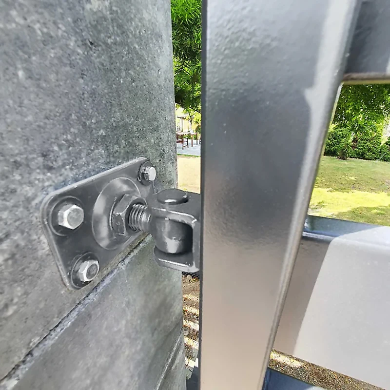 Στη φωτογραφία φαίνεται ενδεικτική συναρμολόγηση του μεντεσέ σε μπετονένιο στύλο πορτακιού. Η πλάκα έχει βιδωθεί με τέσσερις βίδες, και το αυτί του μεντεσέ περικλείει το προφίλ του φύλλου. Αυτό το είδος λύσης είναι κατάλληλο τόσο για χαλύβδινα όσο και για αλουμινένια πορτάκια — παντού όπου απαιτείται αξιόπιστη, ρυθμιζόμενη κατασκευή μεντεσέ.