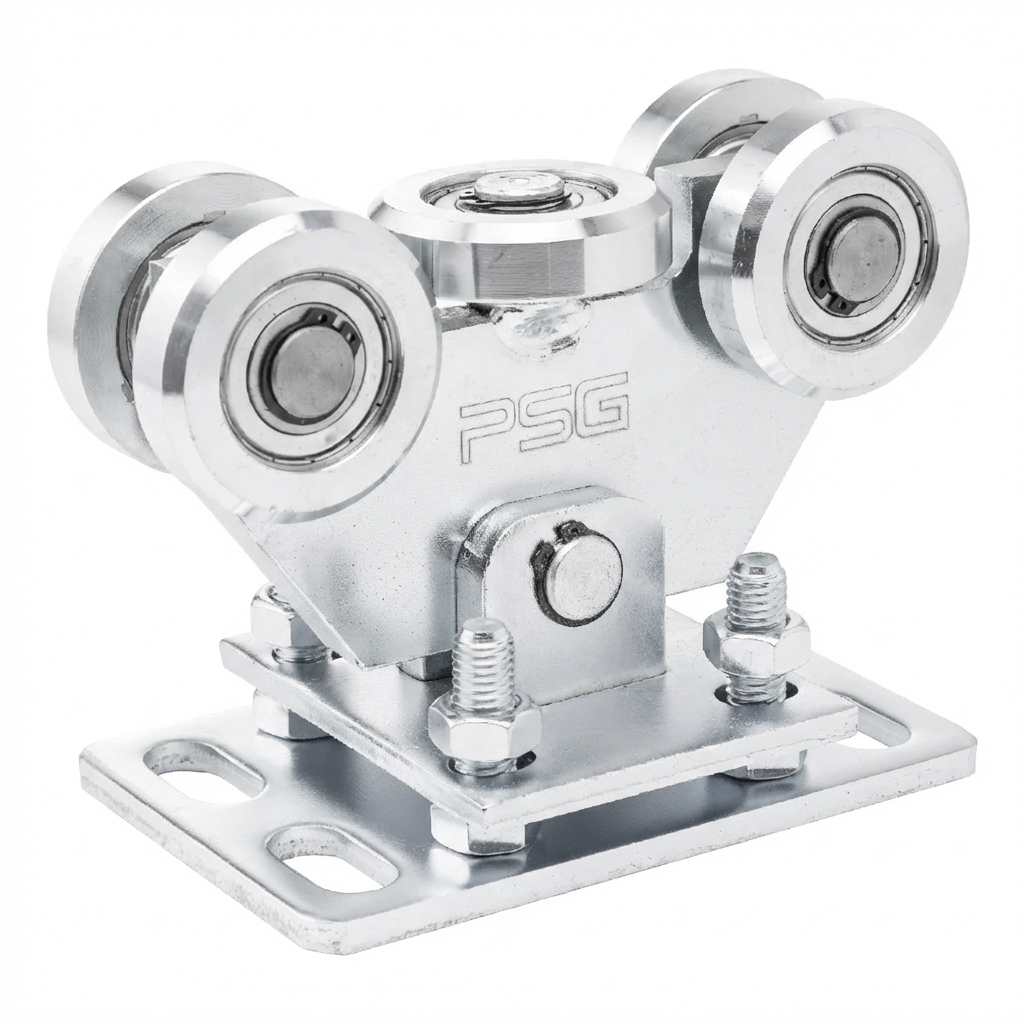 Το τροχοφόρο διαθέτει 5 μεταλλικούς τροχούς, εκ των οποίων ένας οριζόντιος που εξασφαλίζει πρόσθετη σταθεροποίηση της οδήγησης της πύλης. Αιωρούμενη κατασκευή – το τροχοφόρο συνδέεται με τη βάση μέσω άξονα, χάρη στον οποίο προσαρμόζεται αυτόματα στη ράγα της συρόμενης πύλης. Η ρύθμιση ύψους με βίδες επιτρέπει την ακριβή ευθυγράμμιση της πύλης κατά την εγκατάσταση.