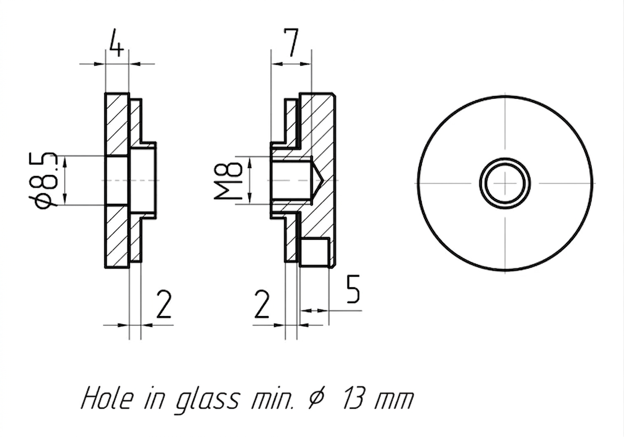 Η βάση προορίζεται για γυαλιά πάχους από 4 mm έως 16,76 mm (συμπεριλαμβανομένου του laminated γυαλιού VSG). Η ελάχιστη διάμετρος της οπής τοποθέτησης στο γυαλί είναι ø 13 mm. Χάρη στο καθολικό σπείρωμα M8 το στοιχείο ενσωματώνεται εύκολα με τυπικά συστήματα ανοξείδωτων κιγκλίδων που τοποθετούνται σε τοίχους, στυλίσκους και επίπεδες κατασκευές.