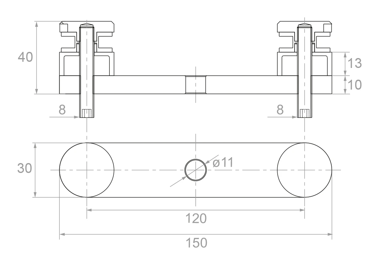Διπλό σημειακό στήριγμα γυαλιού διαμέτρου fi 30 mm και μήκους 150 mm, σχεδιασμένο για στερέωση γυάλινων φύλλων πάχους από 8 έως 21,52 mm. Ιδανικό στοιχείο κιγκλιδωμάτων με γυάλινο γέμισμα — εξασφαλίζει ακαμψία κατασκευής και σταθερή στερέωση γυάλινων πάνελ. Κατασκευασμένο από ανοξείδωτο χάλυβα AISI 304 με σατινέ φινίρισμα, που εγγυάται υψηλή αντοχή στη διάβρωση και αισθητικό, μοντέρνο εμφάνιση τόσο στο εσωτερικό όσο και στο εξωτερικό κτηρίων.