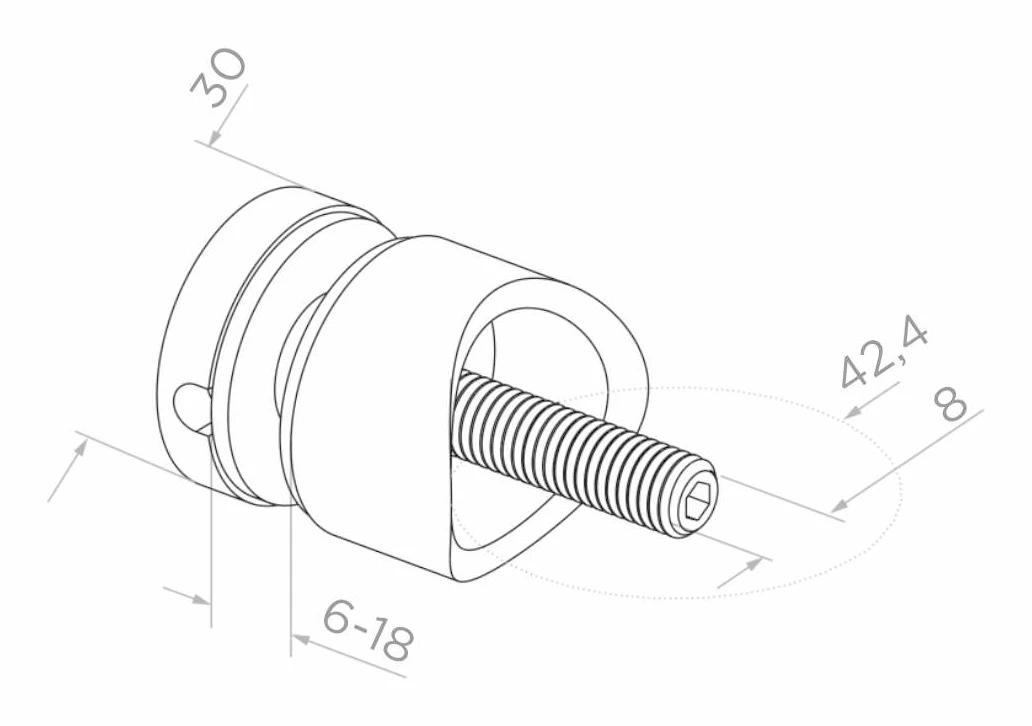Η rotula υποστηρίζει και σταθεροποιεί άρτια το συναρμολογημένο γυάλινο φύλλο. Χάρη στα λάστιχα πίεσης που περιλαμβάνονται στο σετ το στήριγμα εξασφαλίζει ελαστική και ασφαλή πίεση, προστατεύοντας τις άκρες του γυαλιού από βλάβες. Το εύρος ρύθμισης του πάχους του γυαλιού είναι 6–18 mm, το οποίο παρέχει μεγάλη ευελιξία χρήσης — από λεπτούς διακοσμητικούς πίνακες έως παχύτερα φύλλα κιγκλιδωμάτων. Το στοιχείο στερέωσης είναι εξοπλισμένο με σπείρωμα M8, το οποίο εγγυάται ασφαλή και σταθερή στερέωση στη φέρουσα κατασκευή.