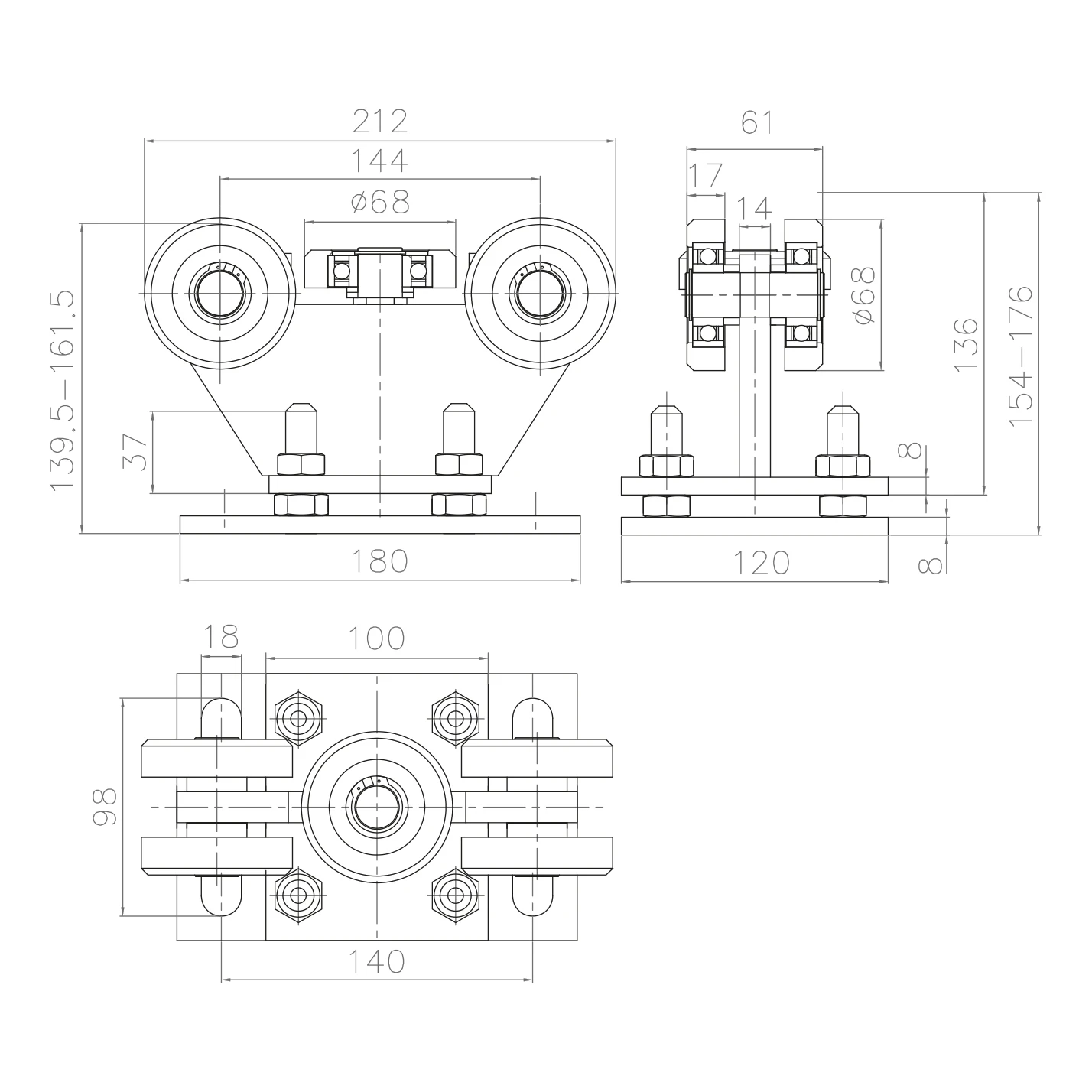 Το βαγονέτο είναι κατάλληλο για ράγα διαστάσεων 80×80×5 mm και τοποθετείται μόνιμα στη βάση. Ο ενσωματωμένος μηχανισμός ρύθμισης ύψους μέσω κοχλιών επιτρέπει την ακριβή οριζοντίωση της πύλης στο εύρος 139,5–161,5 mm (μπροστινή όψη) και 154–176 mm (πλαϊνή όψη), διευκολύνοντας σημαντικά τις εργασίες τοποθέτησης και αντισταθμίζοντας τυχόν ανωμαλίες του εδάφους. Το σύνολο προστατεύεται με επίστρωση ψευδαργύρου, που εγγυάται αντοχή στη διάβρωση και μακροχρόνια χρήση σε εξωτερικούς χώρους.
