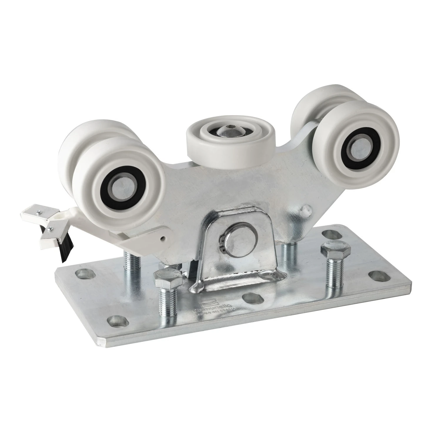 Το καρότσι αποτελείται από μια μαζική πλάκα στερέωσης που βιδώνεται στο θεμέλιο της πύλης και από ένα σώμα με πέντε τροχούς — τρεις κύριους φέροντες και δύο πλευρικούς οδηγούς. Οι νάιλον τροχοί τοποθετημένοι σε ρουλεμάν εξασφαλίζουν ομαλή κίνηση ακόμα και υπό μεγάλα φορτία. Το στοιχείο σύσφιξης (κλιπ) επιτρέπει την ασφαλή ακινητοποίηση της ράγας οδήγησης της πύλης στην υποδοχή του καροτσιού. Χάρη στη μελετημένη κατασκευή, η τοποθέτηση είναι γρήγορη και δεν απαιτεί εξειδικευμένα εργαλεία — αρκεί η βίδωση της πλάκας στερέωσης στο θεμέλιο μέσω των οπών στερέωσης.