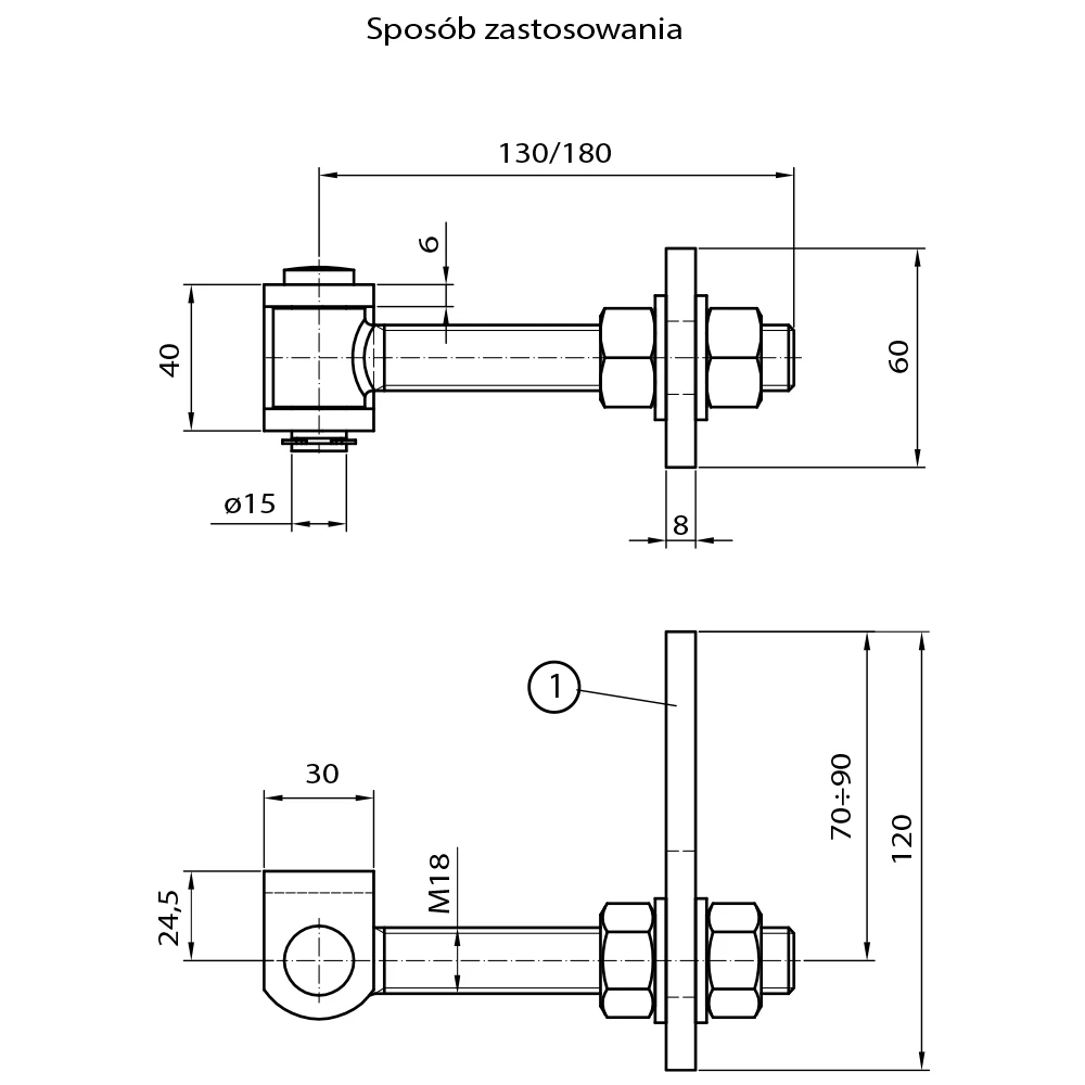 Ο σύνδεσμος τοποθετείται στο φύλλο της πύλης ή της πόρτας, και ο άξονας του μεντεσέ M18 διέρχεται από την οπή φασολιού και στερεώνεται με παξιμάδια και από τις δύο πλευρές. Το σχήμα εφαρμογής δείχνει δύο παραλλαγές μήκους άξονα (130 mm ή 180 mm), το οποίο επιτρέπει την επιλογή του κατάλληλου μεντεσέ για το πάχος του στύλου ή του πλαισίου. Το μανίκι του μεντεσέ (ύψος 40 mm, άξονας Ø15 mm) συγκολλάται στον στύλο, και ο σύνδεσμος με την οπή φασολιού επιτρέπει ομαλή ρύθμιση της θέσης του φύλλου.