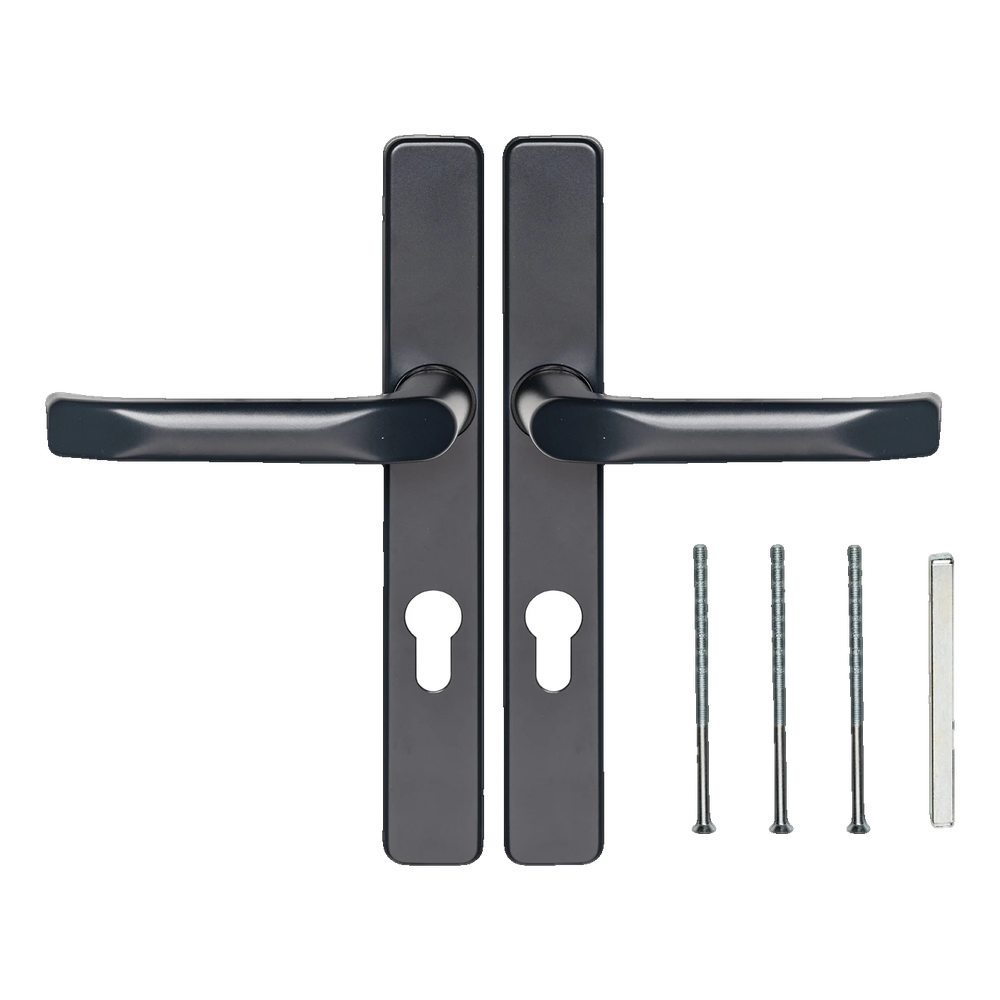 Το σετ προορίζεται για πόρτες εξοπλισμένες με κλειδαριά με κύλινδρο ασφαλείας (οπή PZ ορατή στην πλακέτα). Η τοποθέτηση γίνεται με τις συμπεριλαμβανόμενες διαπεραστικές βίδες — η ορθογώνια μάσκα καλύπτει αισθητικά τις κεφαλές των βιδών, εξασφαλίζοντας καθαρή, μοντέρνα εμφάνιση του εξαρτήματος.