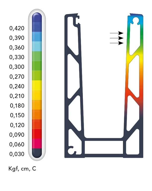 Το προφίλ με μήκος βάσης 1 m υπό οριζόντιο φορτίο έως 500 kg (5000 N·t) διατηρεί υψηλή ακαμψία και ελάχιστες μετατοπίσεις. Η ανάλυση με τη μέθοδο πεπερασμένων στοιχείων (FEM) επιβεβαιώνει ότι οι μέγιστες τιμές μετατοπίσεων υπό φορτίο ανέμου κυμαίνονται από 0,030 έως 0,420 Kgf/cm — οι μεγαλύτερες παραμορφώσεις εμφανίζονται στο επάνω μέρος του προφίλ (κοντά στην άκρη σύσφιξης), ενώ η βάση παραμένει πρακτικά ακίνητη.