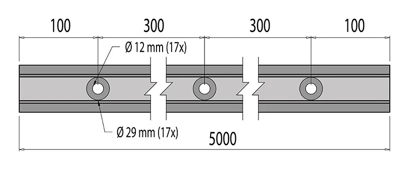 Το προφίλ διαθέτει 17 οπές στερέωσης κατανεμημένες ομοιόμορφα σε όλο το μήκος των 5000 mm. Οι διαμπερείς οπές έχουν διάμετρο Ø 12 mm με εσοχές Ø 29 mm. Η απόσταση αξόνων των οπών είναι 300 mm, και η απόσταση από το άκρο του προφίλ μέχρι τον άξονα της πρώτης και τελευταίας οπής είναι 100 mm.