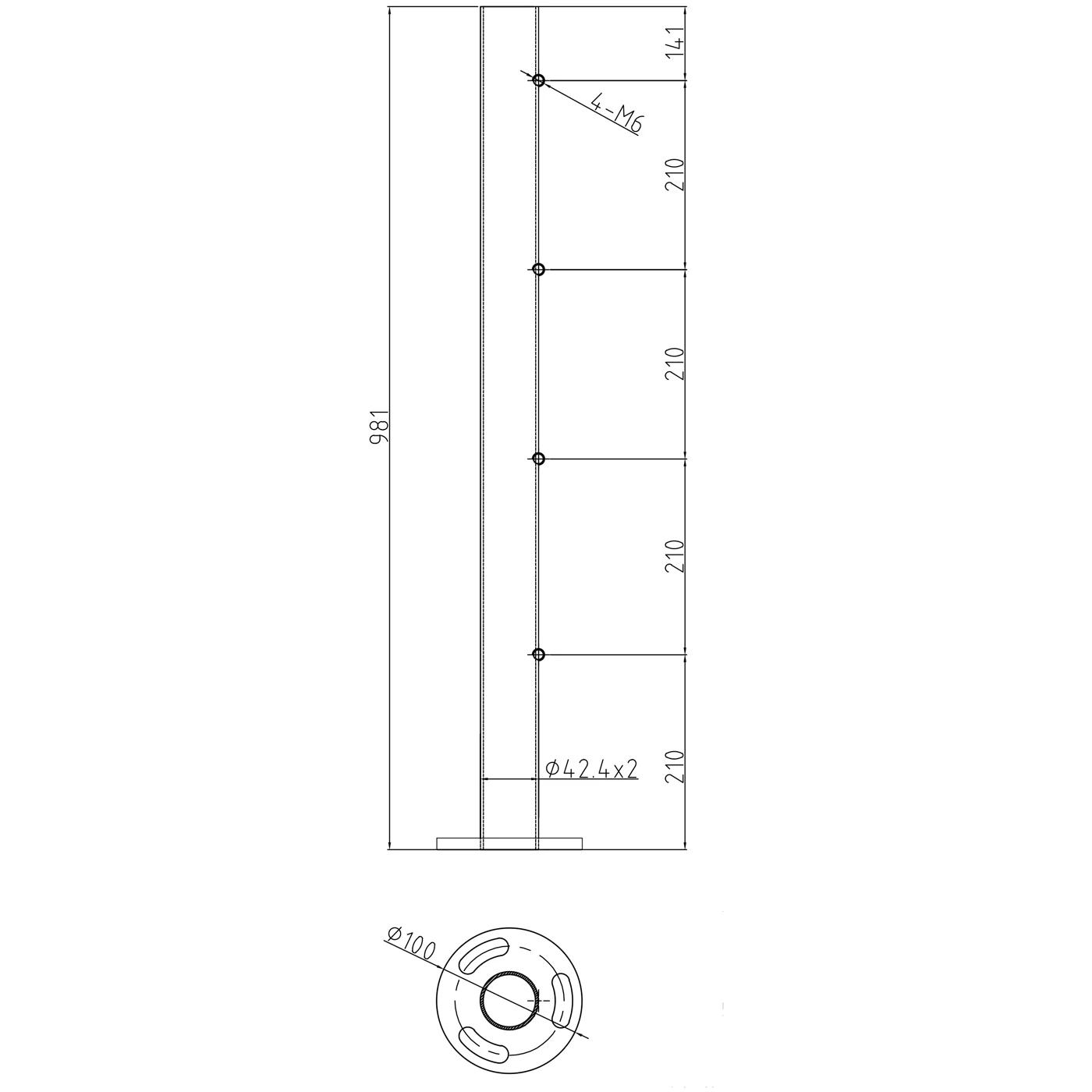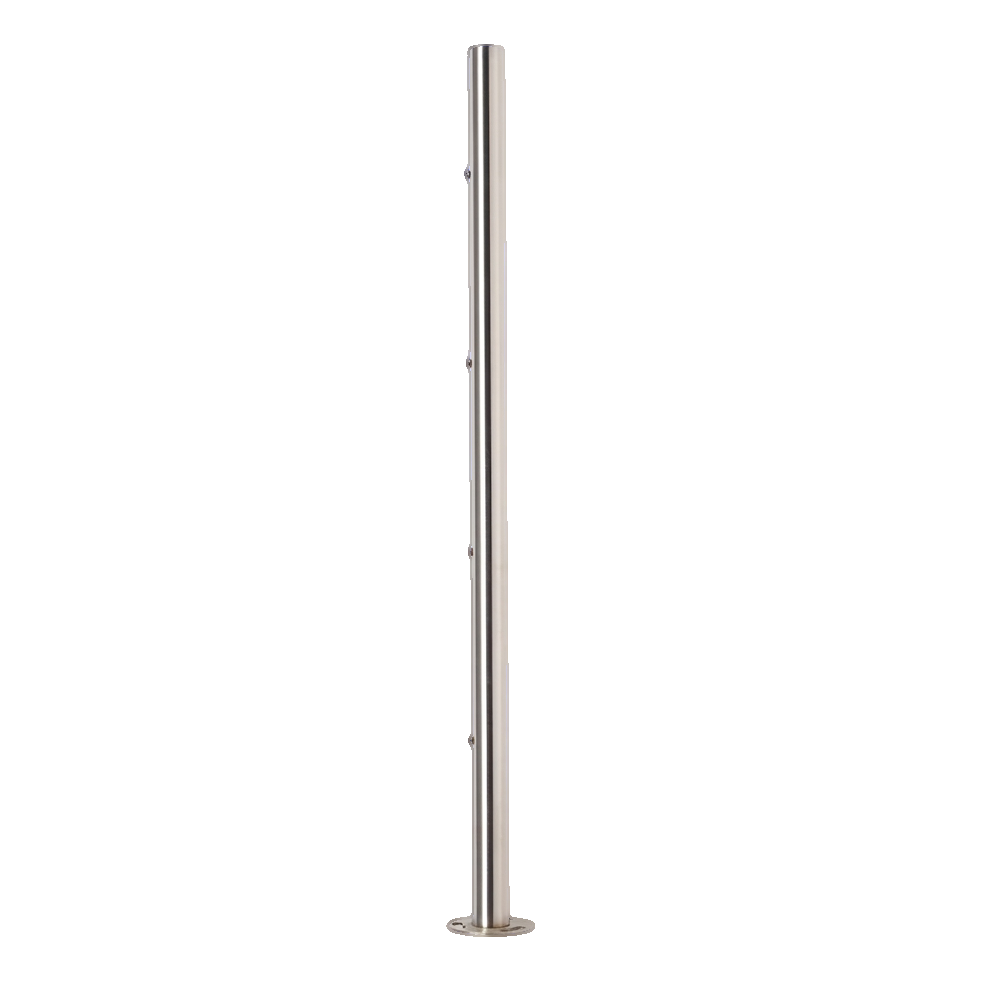 Ο στύλος είναι τύπου μη εξοπλισμένου — διαθέτει 4 οπές με σπείρωμα M6 τοποθετημένες σε ίσες αποστάσεις των 210 mm, επιτρέποντας την ελεύθερη επιλογή και τοποθέτηση οποιωνδήποτε στηριγμάτων ράβδων, σωλήνων ή γεμισμάτων. Χάρη σε αυτό, ο εγκαταστάτης έχει πλήρη ευελιξία στη διαμόρφωση της κουπαστής σύμφωνα με το συγκεκριμένο έργο.