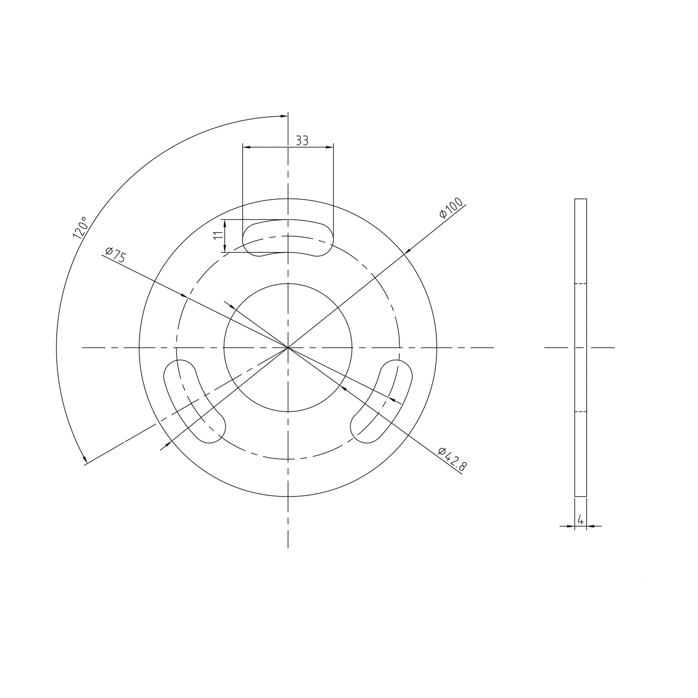 - Οπές στον κρίκο: 3 τεμ. (φασόλια 33 × 11 mm) σε κύκλο ø75 mm, κάθε 120°
