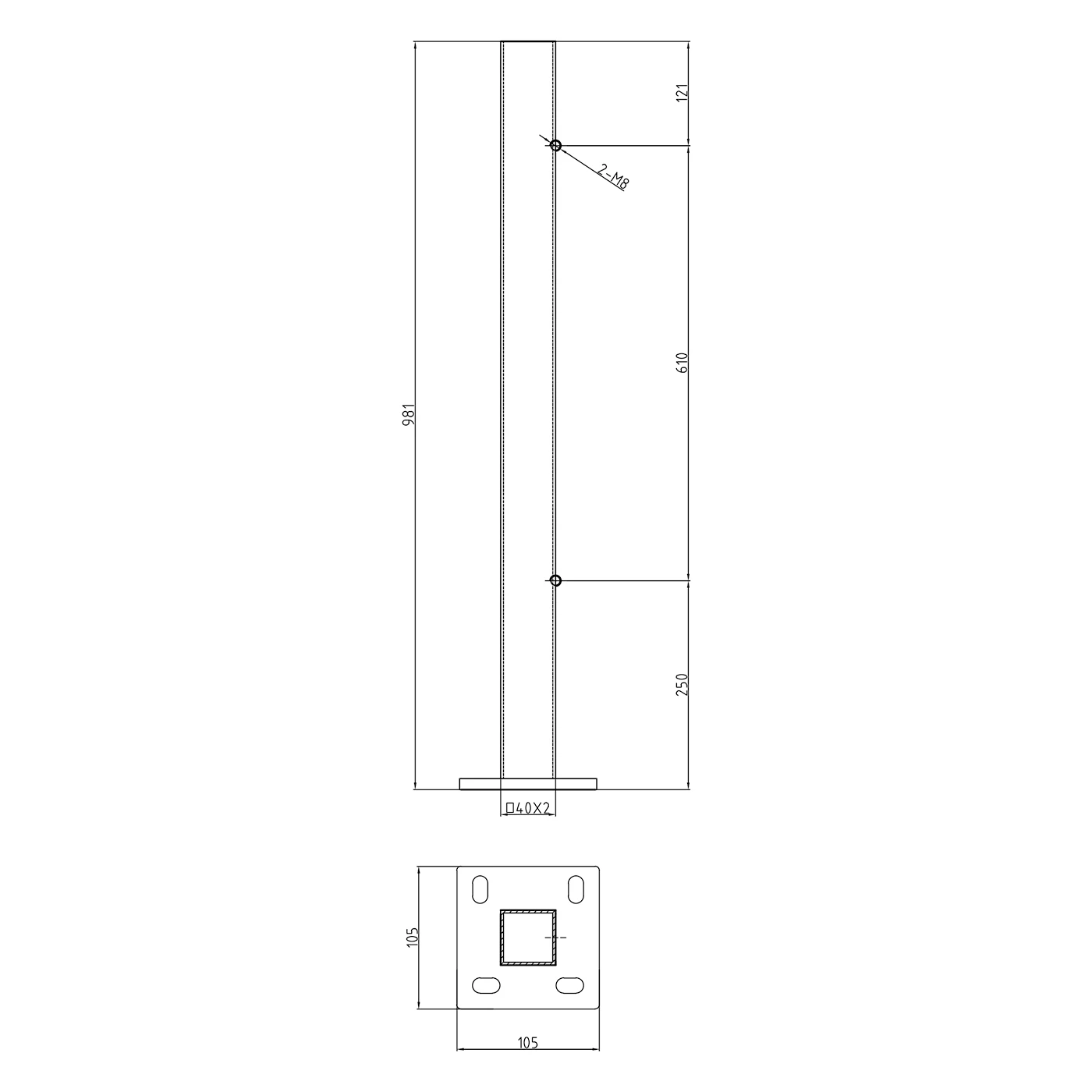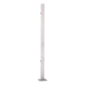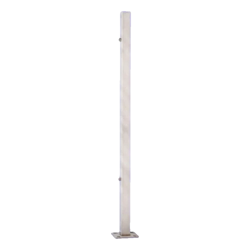 Το στύλο τοποθετείται άμεσα στο δάπεδο με τη συγκολλημένη βάση διαστάσεων 105×105 mm με τέσσερις οπές φασολιού. Το οβάλ σχήμα των οπών (20×11 mm) επιτρέπει διόρθωση της τοποθέτησης κατά την εγκατάσταση. Δύο οπές με σπείρωμα M8 τοποθετημένες στο στύλο σε απόσταση 610 mm επιτρέπουν γρήγορη στερέωση λαβών εγκάρσιων ράβδων κιγκλιδώματος χωρίς την ανάγκη τρυπήματος ή σπειρώματος στο εργοτάξιο.