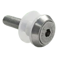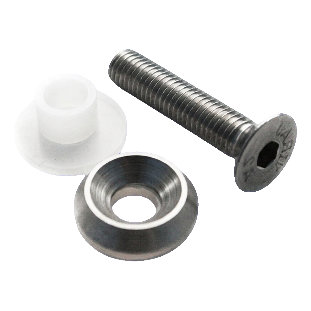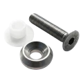 Σετ προορισμένο για στερέωση γυάλινων φύλλων σε κουπαστές από ανοξείδωτο χάλυβα που συναρμολογούνται σε επίπεδες επιφάνειες. Η κωνική κεφαλή της βίδας DIN 7991 εισχωρεί στην κωνική ροδέλα, δημιουργώντας λεία, κομψή επιφάνεια στη θεατή πλευρά. Το μονωτικό καπούτσο από πλαστικό διέρχεται από την οπή του γυαλιού και εξασφαλίζει πλήρη διαχωρισμό των υλικών — εξαλείφει τον κίνδυνο θερμικών ρωγμών και γαλβανικής διάβρωσης. Χάρη στην πληρότητα του σετ, ο εγκαταστάτης δεν χρειάζεται να επιλέξει ξεχωριστά ροδέλες και μονωτικά, κάτι που επιταχύνει τη συναρμολόγηση και ελαχιστοποιεί τον κίνδυνο λαθών στο εργοτάξιο.