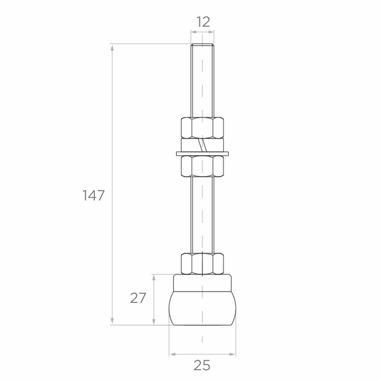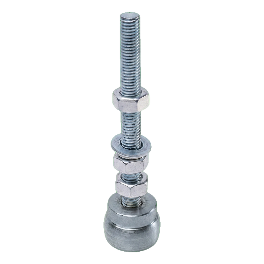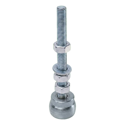 Η οδήγηση αποτελείται από σπειρωμένο άξονα M12 με δύο παξιμάδια και ροδέλες, που επιτρέπουν τη ρύθμιση ύψους και την ασφαλή στερέωση στο κάτω προφίλ της πόρτας. Το κάτω μέρος είναι εξοπλισμένο με ατσάλινο ρολό οδήγησης διαμέτρου 25 mm, που κινείται στην κάτω ράγα και διατηρεί το φύλλο της πόρτας στη σωστή τροχιά. Χάρη στη σπειρωμένη ρύθμιση ο εγκαταστάτης μπορεί να ρυθμίσει με ακρίβεια το κενό μεταξύ ρολού και ράγας — κάτι που συμβάλλει σε αθόρυβη και ομαλή λειτουργία της πόρτας.