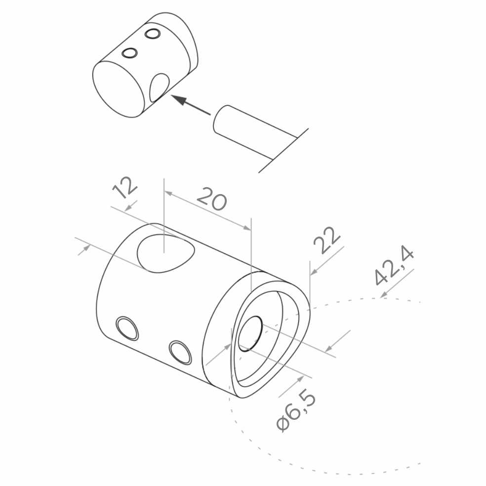 Η λαβή στηρίζεται στον φέροντα σωλήνα της κουπαστής διαμέτρου 42,4 mm με βίδα που διέρχεται από την κεντρική οπή ø 6,5 mm. Η ράβδος γεμίσματος διαμέτρου 12 mm εισάγεται στην πλαϊνή οπή και σφίγγεται με πλαϊνές βίδες (imbus), εξασφαλίζοντας ασφαλή και διαρκή σύνδεση. Το προϊόν προορίζεται για επαγγελματικά συστήματα κουπαστών από ανοξείδωτο χάλυβα — ιδανικό για στήριξη κουπαστών σκάλας, μπαλκονιού και βεράντας.