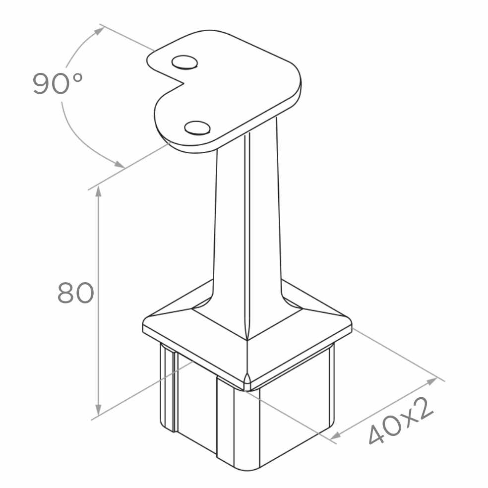 Το στήριγμα λειτουργεί ως γωνιακός σύνδεσμος μεταξύ του τετράγωνου στύλου 40x40 mm και της επίπεδης κουπαστής του κιγκλιδώματος. Ο άξονας διατομής 14x14 mm εισέρχεται στο εσωτερικό της κουπαστής, ενώ το κάτω μέρος τοποθετείται στο προφίλ του στύλου. Για την τοποθέτηση πρέπει να χρησιμοποιηθεί αναερόβια κόλλα — η σύνδεση είναι μόνιμη, αισθητική και δεν απαιτεί κανένα ορατό στοιχείο σύνδεσης. Χάρη σε αυτό το τελειωμένο κιγκλίδωμα διατηρεί μινιμαλιστική, σύγχρονη εμφάνιση.