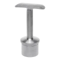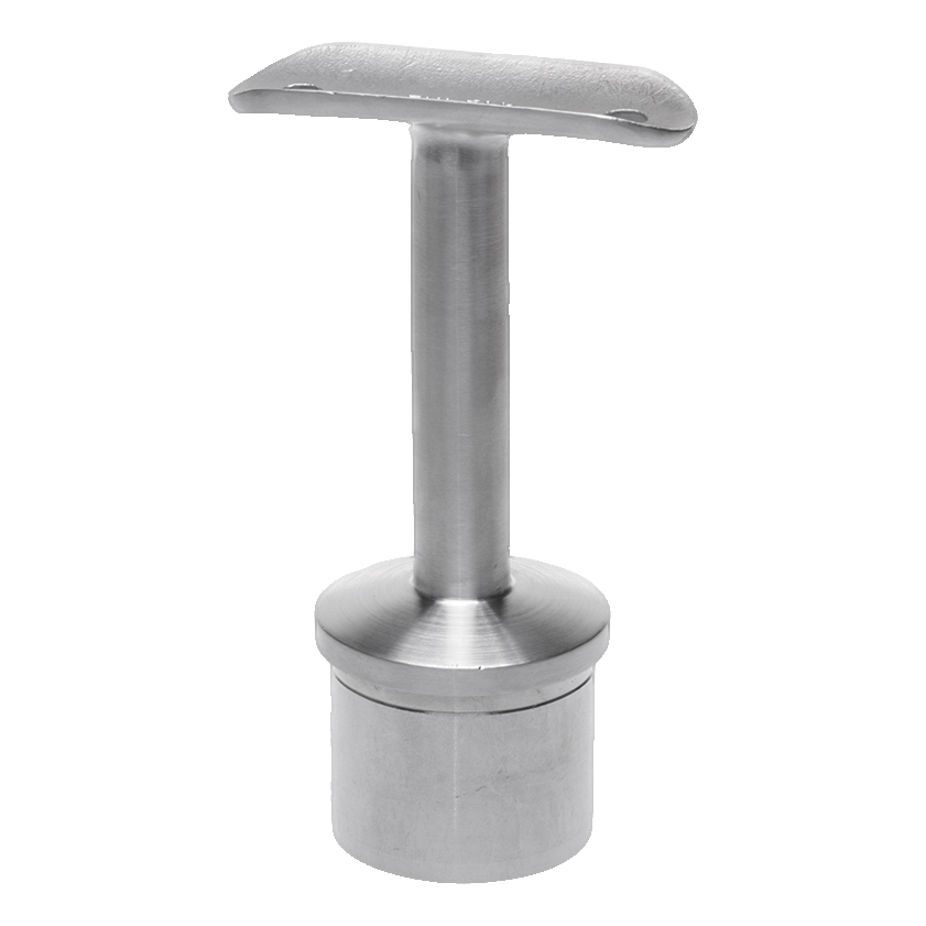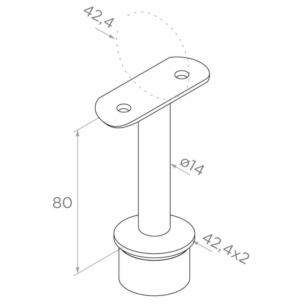 Η βάση του στηρίγματος είναι προσαρμοσμένη σε σωλήνα στύλου διαστάσεων 42,4 × 2 mm (εξωτερική διάμετρος × πάχος τοιχώματος), ενώ η σέλα στο πάνω μέρος δέχεται κουπαστή διαμέτρου 42,4 mm. Η συμπαγής κατασκευή ύψους 80 mm και άξονα ø14 mm εξασφαλίζει στέρεη και σταθερή στήριξη της κουπαστής. Ο ανοξείδωτος χάλυβας AISI 316 εγγυάται υψηλή αντοχή στη διάβρωση — αποδίδει τόσο στο εσωτερικό κτιρίων όσο και εξωτερικά, συμπεριλαμβανομένων περιβαλλόντων εκτεθειμένων στη δράση αλατιού και υγρασίας.