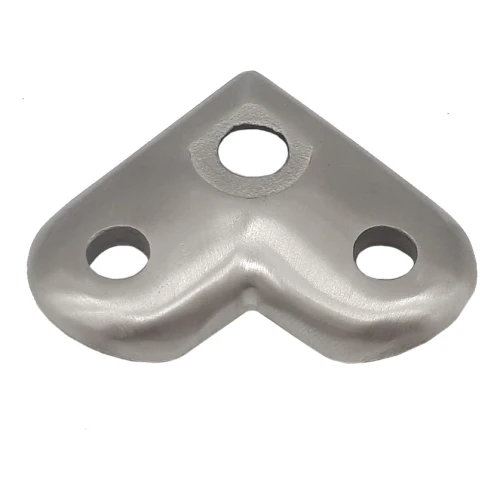 Η πλάκα προορίζεται για στερέωση υποστηριγμάτων κουπαστής σε γωνίες — εκεί όπου η κατεύθυνση του κάγκελου αλλάζει κατεύθυνση. Η τοποθέτηση γίνεται βιδώνοντας την πλάκα από πάνω σε επίπεδη επιφάνεια (π.χ. στύλος ή φέρων στύλος). Οι τρεις οπές στήριξης εξασφαλίζουν σταθερή, τριών σημείων στερέωση και εξαλείφουν τον κίνδυνο περιστροφής του στοιχείου υπό φορτίο.