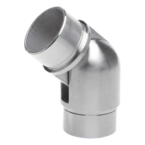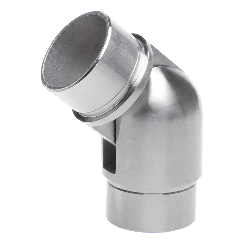 Γωνιακός σύνδεσμος για σωλήνα κουπαστής διαμέτρου 42,4 mm και πάχους τοιχώματος 2 mm, με ρύθμιση γωνίας στο εύρος 90°–180°. Σύνδεσμος προορισμένος για την κατασκευή κουπαστών από ανοξείδωτο χάλυβα — επιτρέπει την ομαλή αλλαγή κατεύθυνσης του χειρολισθήρα σε σκάλες, ράμπες και εξέδρες, εξαλείφοντας την ανάγκη χρήσης πολλών παραλλαγών γωνιακών συνδέσμων σταθερής γωνίας.