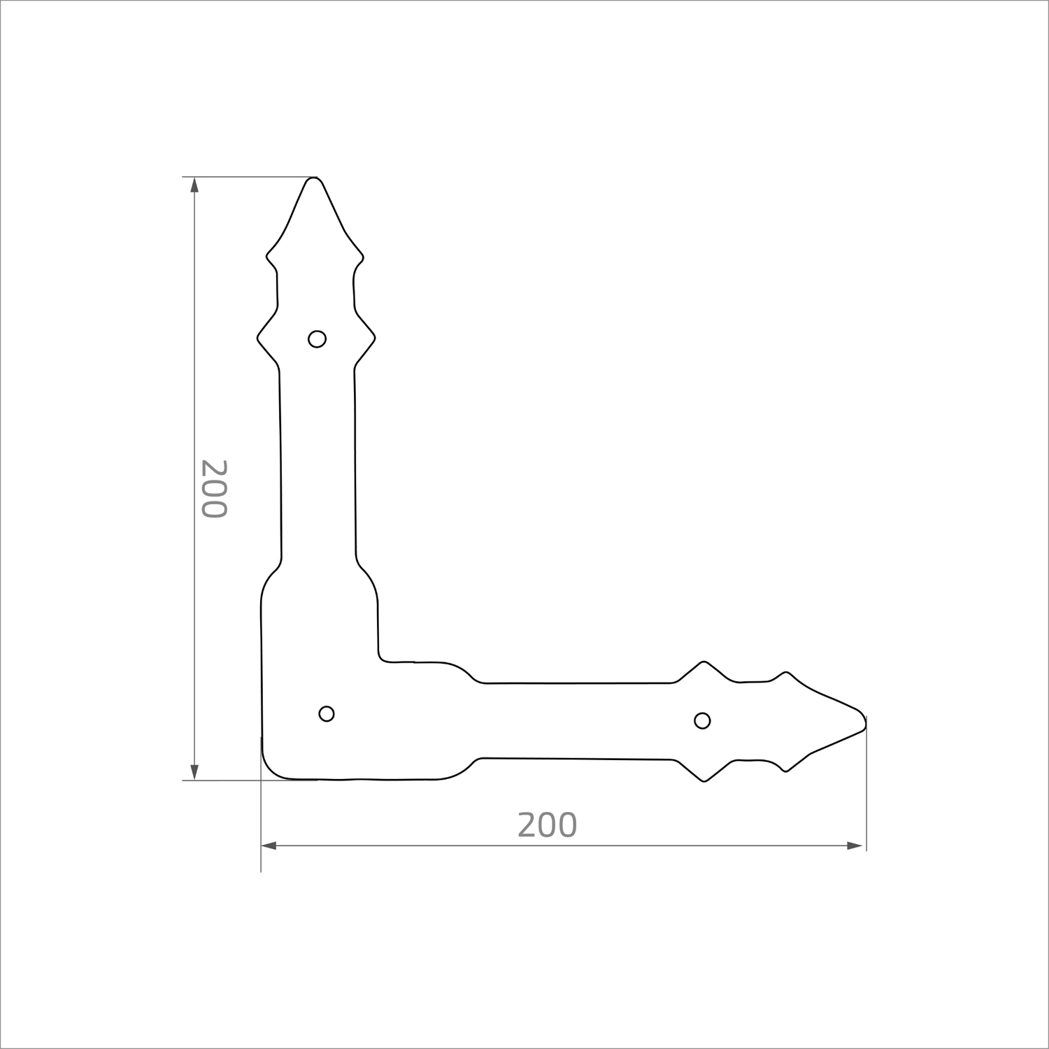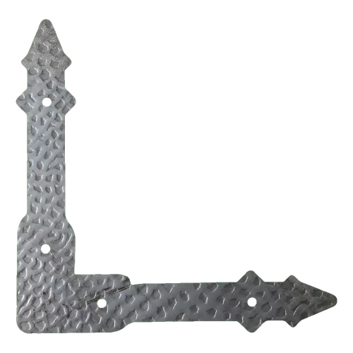 Η χαλύβδινη ενίσχυση γωνίας 200×200 mm της εταιρείας Postal είναι διακοσμητική επένδυση προορισμένη για ενίσχυση και στερέωση των γωνιών πυλών, πορτών και θυρών. Χάρη στη διακοσμητική σφυρήλατη υφή και τα χαρακτηριστικά τελειώματα σε σχήμα αιχμής, το στοιχείο συνδυάζει την κατασκευαστική λειτουργία με την αισθητική — εντάσσεται τέλεια στη διαμόρφωση κατασκευασμένων πυλών και περίφραξης σε αγροτικό στυλ.
