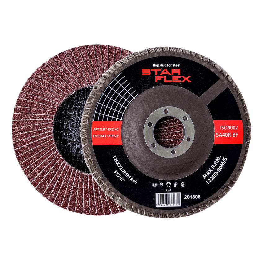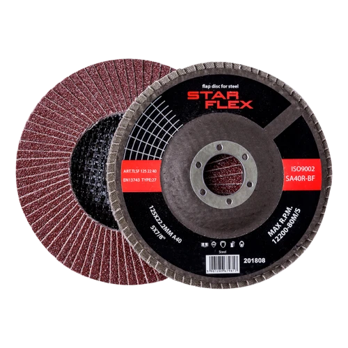 Δίσκος φινιρίσματος Star Flex T29 διαμέτρου 125 mm και κοκκομετρίας 40 — υψηλής ποιότητας λειαντικό εργαλείο με κάλυψη κορούνδου, σχεδιασμένο για εντατική επεξεργασία ατσαλιού. Η λυγισμένη κατασκευή τύπου T29 εξασφαλίζει βέλτιστη επαφή με το υλικό σε γωνία εργασίας 10°–25°, που μεταφράζεται σε αποτελεσματική λείανση ακμών, λοξότμηση και αφαίρεση συγκολλήσεων χωρίς υπερβολική πίεση.