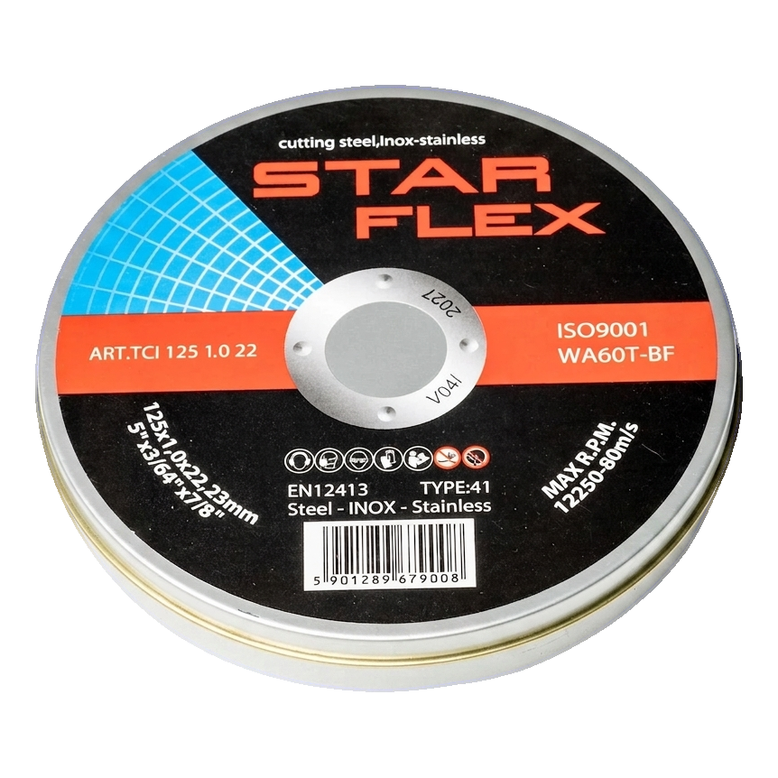 Η ονομασία WA60T-BF στους δίσκους Starflex υποδηλώνει λευκό κορούνδιο λειαντικό (WA) κοκκομετρίας 60, σκληρότητας T (πολύ σκληρό) και συνδετικού υλικού ρητίνης ενισχυμένου με ίνες (BF). Αυτός ο συνδυασμός εξασφαλίζει βέλτιστη ισορροπία μεταξύ επιθετικότητας κοπής και αντοχής δίσκου — ακόμη και σε εντατική χρήση σε ανοξείδωτο χάλυβα, που παράγει υψηλές θερμοκρασίες στη ζώνη κοπής.