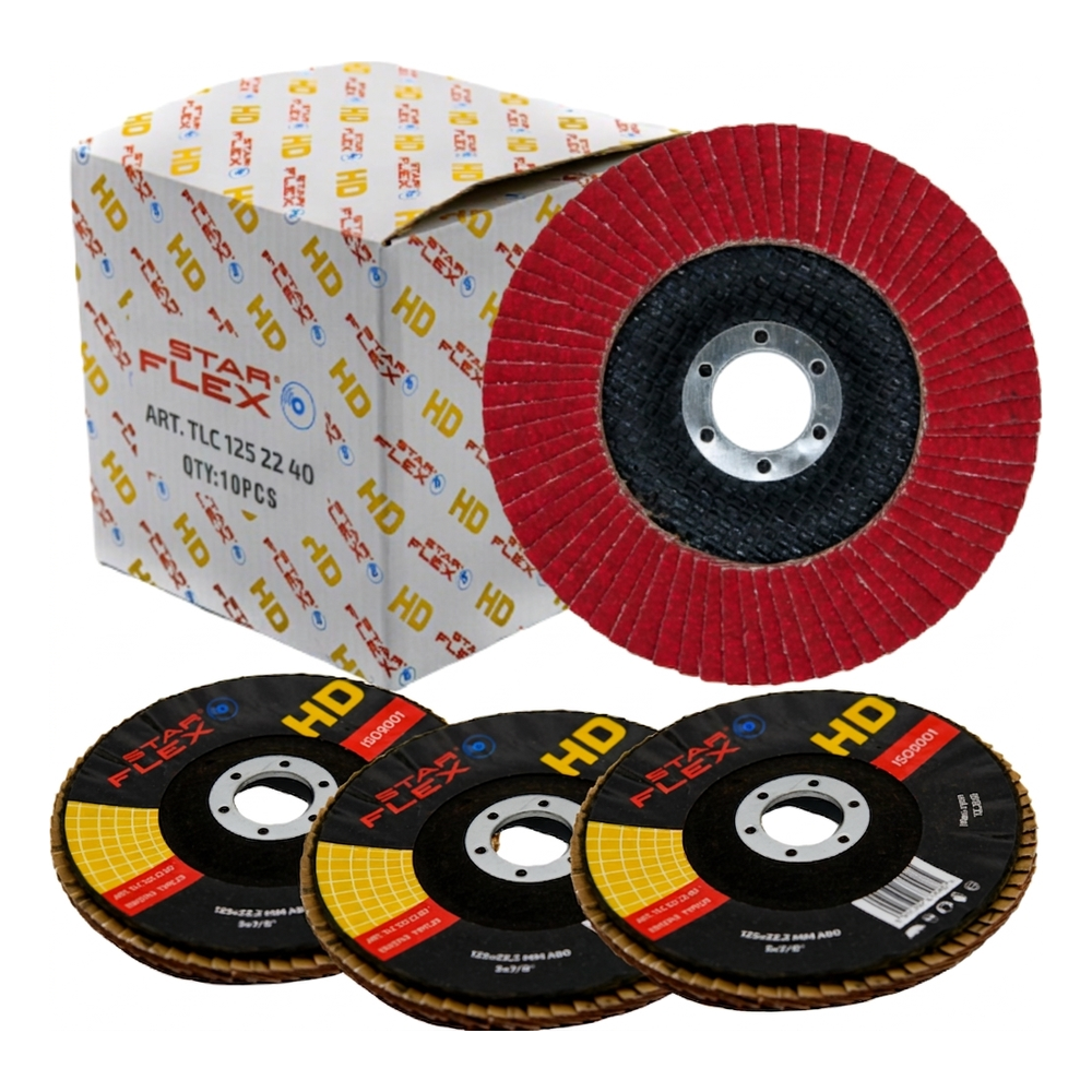 Starflex HD είναι ένας καινοτόμος δίσκος φυλλαράκια με κεραμικό κόκκο, σχεδιασμένος για εντατική χονδροεπεξεργασία και λείανση χάλυβα, ανοξείδωτου χάλυβα (INOX), χρωμίου, τιτανίου και άλλων δύσκολα επεξεργάσιμων μετάλλων. Ο αυτοακονιζόμενος κεραμικός κόκκος, ομοιόμορφα κατανεμημένος στα φυλλαράκια, εξασφαλίζει μέγιστη αφαίρεση υλικού σε σύντομο χρόνο — ιδανική λύση για συνεργεία εγκατάστασης που χρειάζονται αξιόπιστο εργαλείο για καθημερινή εργασία σε εργοτάξια και εργαστήρια.